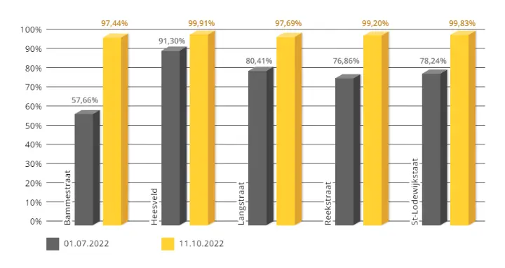 One successful example of the effectiveness of SCaaS in the city of Bilzen, where significant changes in driving behaviour were observed within just three months of implementing the system.  Here's an example of the trend in Bilzen drivers adhering to speed limits  where grey represents before SCaaS and yellow after installation: