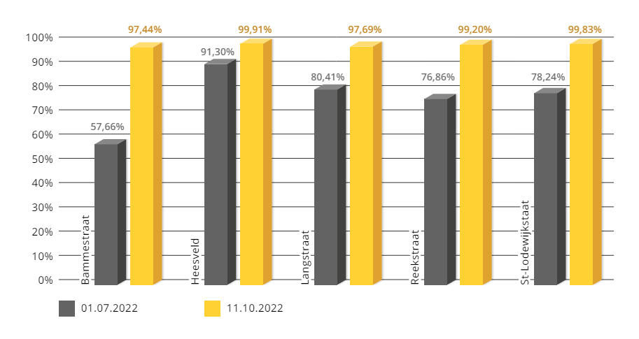 One successful example of the effectiveness of SCaaS in the city of Bilzen, where significant changes in driving behaviour were observed within just three months of implementing the system. Here's an example of the trend in Bilzen drivers adhering to speed limits where grey represents before SCaaS and yellow after installation: